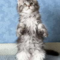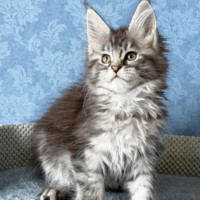 Hello, I’m Nile. I’m a Maine Coon girl with a black smoke blotched tabby coat that reveals soft contrast as I move, and bright orange eyes that give me a warm, attentive expression. I already carry the calm confidence my breed is known for — steady, observant, and quietly self-assured. My body is developing into a strong, well-balanced Maine Coon frame, with solid paws and an unhurried, graceful way of moving. I eat Royal Canin food, which supports my healthy growth and helps me develop evenly and comfortably.