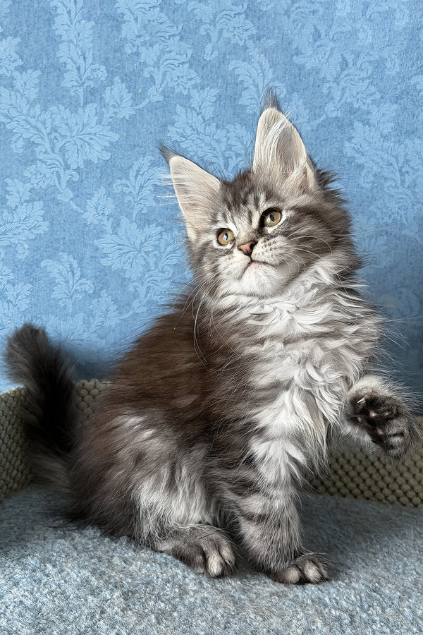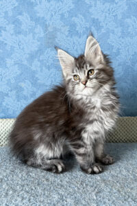 Hello, I’m Nile. I’m a Maine Coon girl with a black smoke blotched tabby coat that reveals soft contrast as I move, and bright orange eyes that give me a warm, attentive expression. I already carry the calm confidence my breed is known for — steady, observant, and quietly self-assured. My body is developing into a strong, well-balanced Maine Coon frame, with solid paws and an unhurried, graceful way of moving. I eat Royal Canin food, which supports my healthy growth and helps me develop evenly and comfortably.