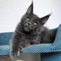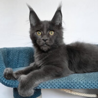 Hi, I’m Nitta a blue smoke Polydactyl Maine Coon girl with bright yellow eyes, a soft misty coat, and extra-special paws that make me one of a kind. I’m a true poly baby: 6,6 toes on my front paws and 4,4 on my back paws, delicate, unique, and absolutely adorable. I eat Gosbi and feel my best on a cozy daily routine with good meals, soft blankets, and plenty of affection.