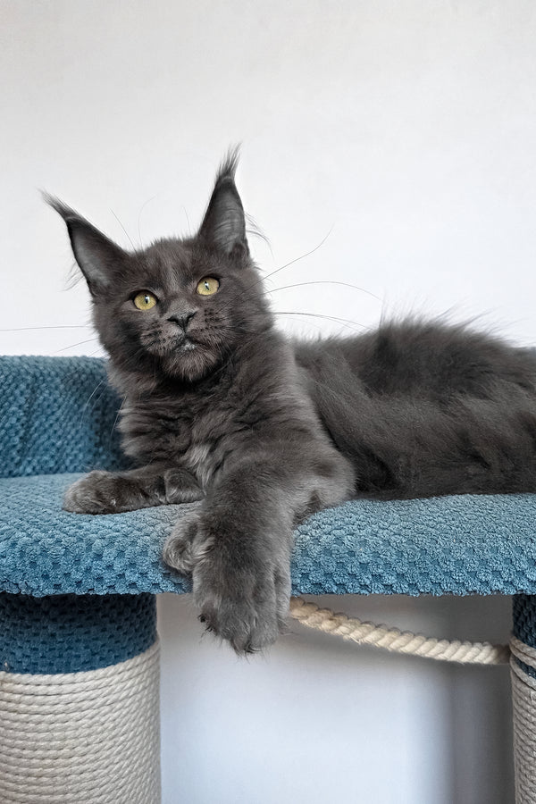 Hi, I’m Nitta a blue smoke Polydactyl Maine Coon girl with bright yellow eyes, a soft misty coat, and extra-special paws that make me one of a kind. I’m a true poly baby: 6,6 toes on my front paws and 4,4 on my back paws, delicate, unique, and absolutely adorable. I eat Gosbi and feel my best on a cozy daily routine with good meals, soft blankets, and plenty of affection.