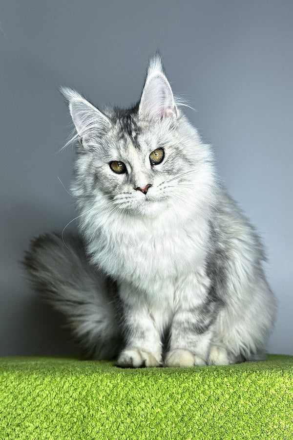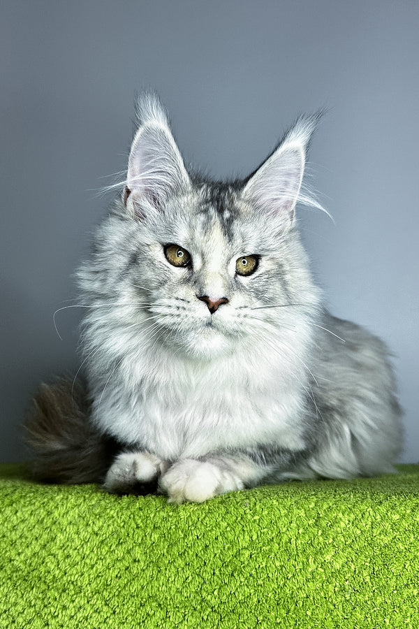 Hi, I’m Vanilla a Maine Coon girl in black tortoise silver ticked tabby with warm hazel eyes. My coat is a painterly blend of silver with soft tortie accents that shimmer when I move, and I carry myself with that classic Maine Coon poise: long tail, well-set ears, and a calm, attentive gaze. I’m gentle, observant, and affectionate happy to chase a feather in playful bursts, then settle nearby to keep you company. I eat Savory (holistic), which keeps my energy smooth and my coat plush for our brushing sessions (I purr the whole time).